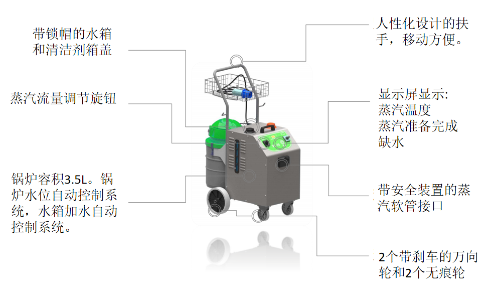 更耐用:鍋爐、底盤(pán)和推車部分均采用不銹鋼材質(zhì),堅(jiān)固耐用。